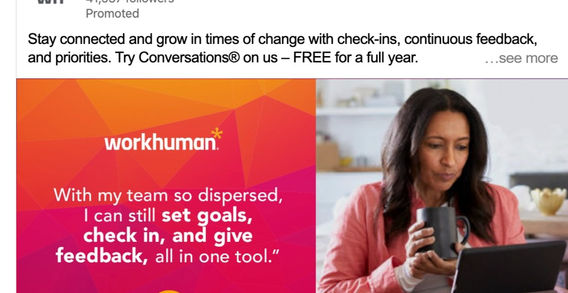 In response to the COVID-19 pandemic, Workhuman® wanted to honor it’s mission to build connection and lift employees in the best of times, the worst of times – and all the time. And as everyone moves forward with the “next normal,” keeping employees connected and engaged is key. Workplaces that are thriving in this landscape have one thing in common: strong work cultures. Our Workhuman® Cloud products facilitate this and can turn isolation into recognition, connection, and celebration. Now, and always, human connection is the most powerful force in the workplace – and the world. And to come out of this stronger, we need to lean into that fact. To help even more during these challenging times, we made our solutions free through March 2021. I wrote the microsite highlighting this sentiment as well as the social ads. More than 10% of our customer base raised their hands about this offer, and 1.5. million employees in organizations are impacted by it – staying close, connected, and on track.